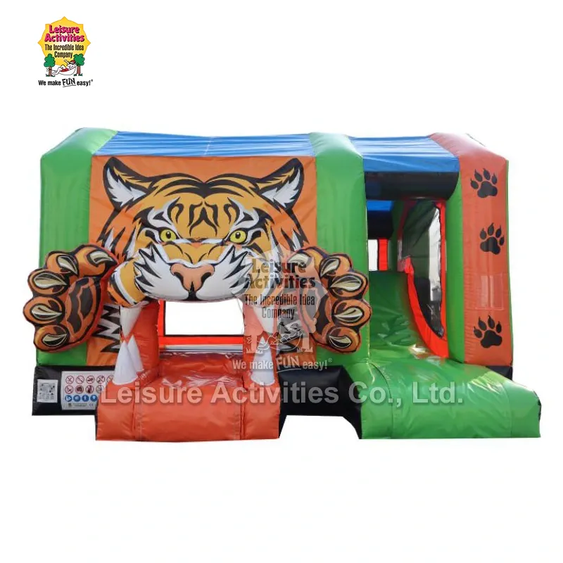 Leisure Activities® er en professionel producent og leverandør af oppustelige produkter i Kina. Standard oppustelige Multiplay Tiger Bouncy Castles er et oppusteligt slot med tigertema, der kombinerer hoppe-, klatre- og glidefunktioner. Den har limegrøn og orange som hovedfarver, med en 3D tigerdekoration ved indgangen. Det kan hurtigt sættes op på kun 10 minutter.